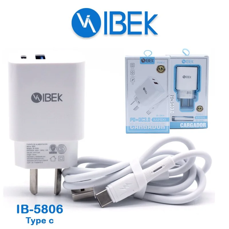 Cargador con cable conector «C» Ibek 5.8A con 2 conexiones, carga rápida. 1 salidas conector A y 1 salida conector C.