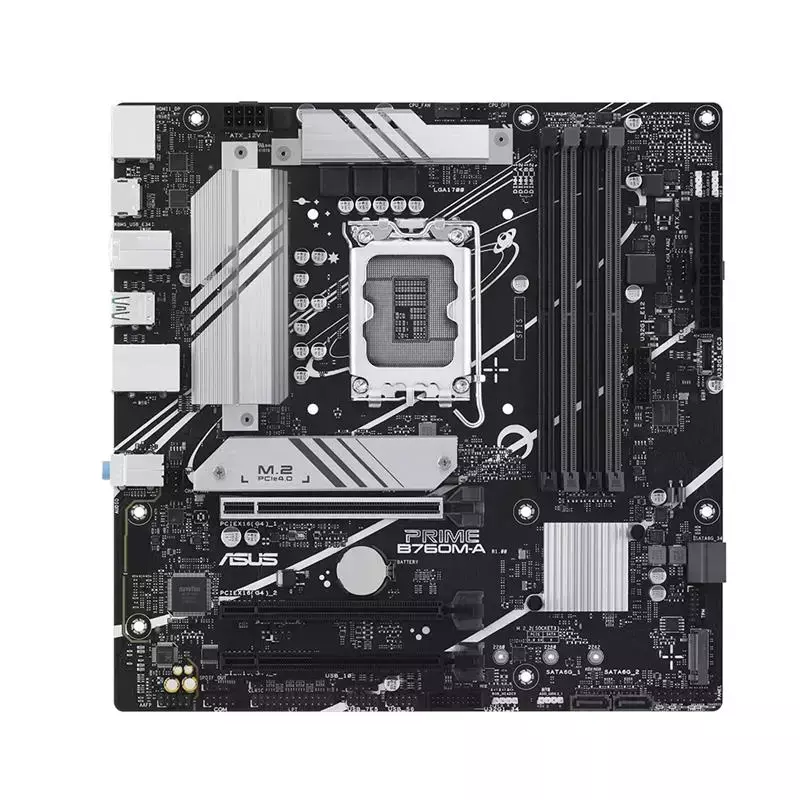 El ASUS PRIME B760M-A es un motherboard micro-ATX diseñado para ofrecer un rendimiento sólido y confiable en sistemas gaming, productividad y creación de contenido. Con soporte para los procesadores Intel® Core™ de 12.ª y 13.ª generación, este motherboard combina tecnología avanzada, refrigeración eficiente y conectividad ultrarrápida en un formato compacto y altamente funcional.