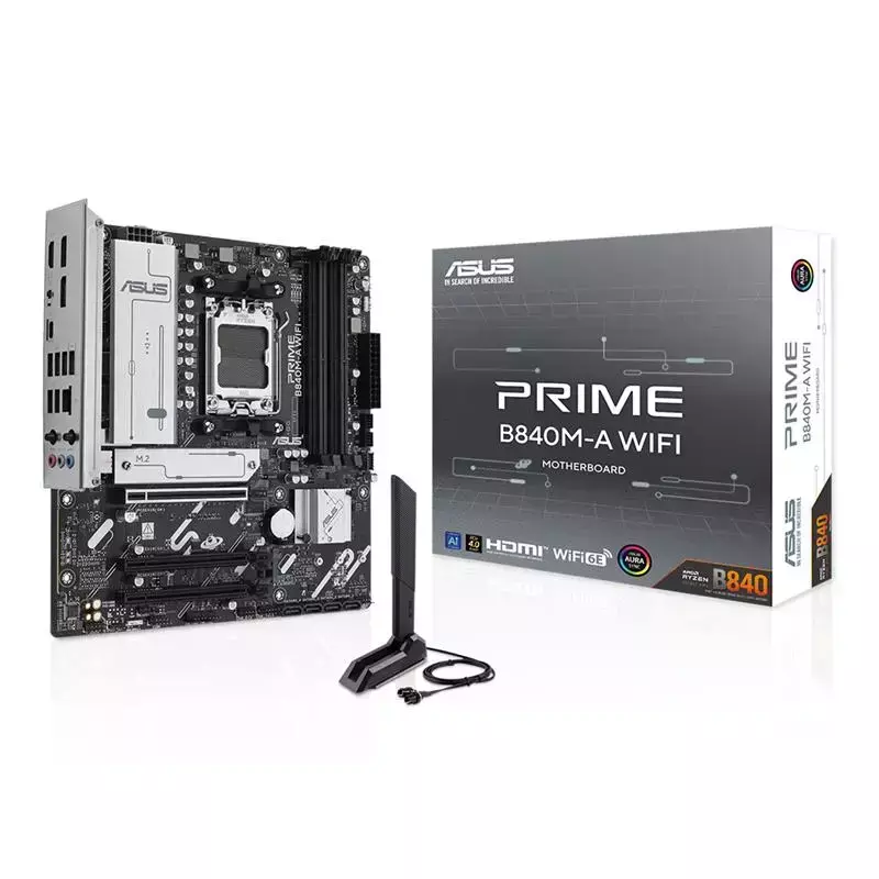 El ASUS PRIME B840M-A WIFI es un motherboard micro-ATX diseñado para potenciar los procesadores AMD Ryzen™ de las series 9000, 8000 y 7000. Ideal para gamers, creadores de contenido y usuarios que buscan una plataforma preparada para aplicaciones de inteligencia artificial, este motherboard combina estabilidad, conectividad ultrarrápida y funciones avanzadas como WiFi 6E, Aura Sync RGB y ASUS AI Advisor, todo en un diseño compacto y listo para el futuro.